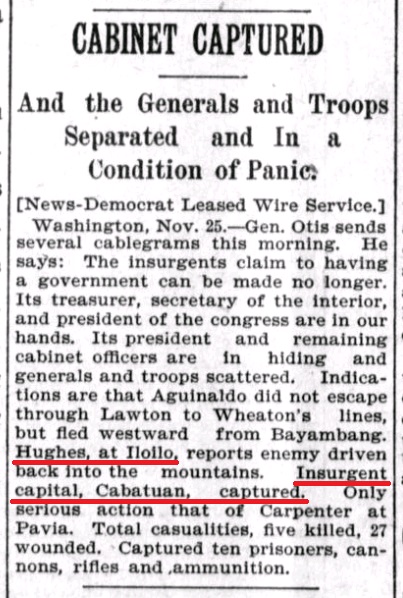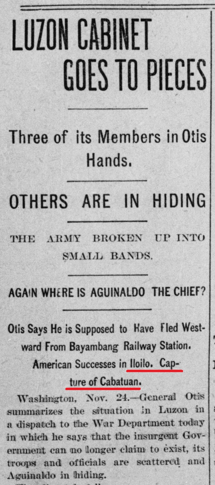 U.S. Newspapers publish the capture of Cabatuan, Iloilo, the insurgent capital