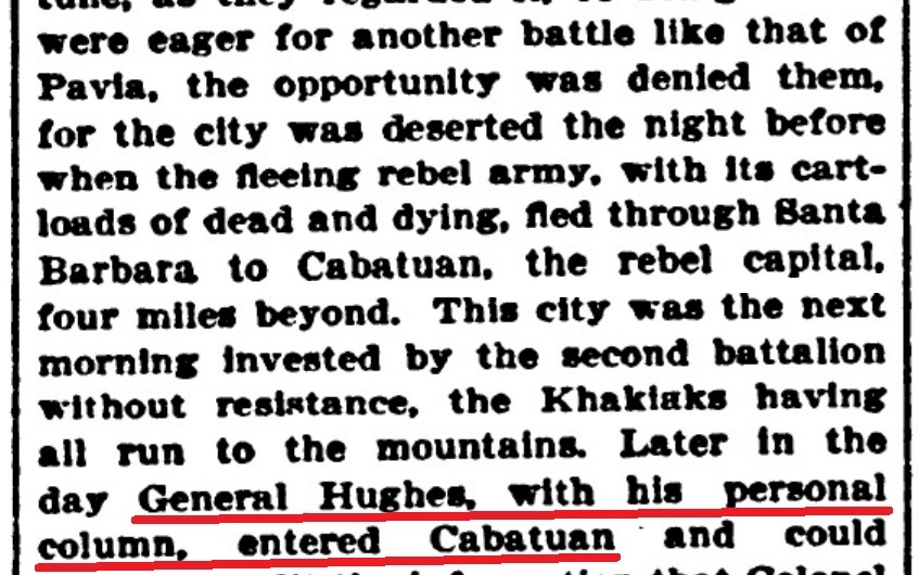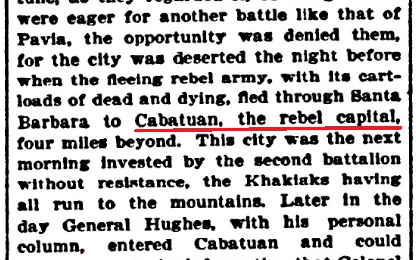 Gen. Otis and Gen. Hughes also recognized that Cabatuan was the "insurgent capital" or the "seat of government," as can be read from their official communications when Hughes captured the town.