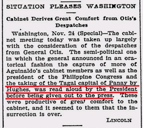 Washington, Nov. 24 (Special) - The cabinet meeting today was taken up largely with the consideration of the despatches from General Otis. The semi-political one in which the general announced in an oratorical fashion the capture of more of Aguinaldo's cabinet members as well as the president of the Philippine Congress and the taking of the Tagal capital of Panay by Hughes, was read aloud by the President before being given out to the press. These were productive of great comfort to the cabinet, and it seemed to them that the insurrection is over.