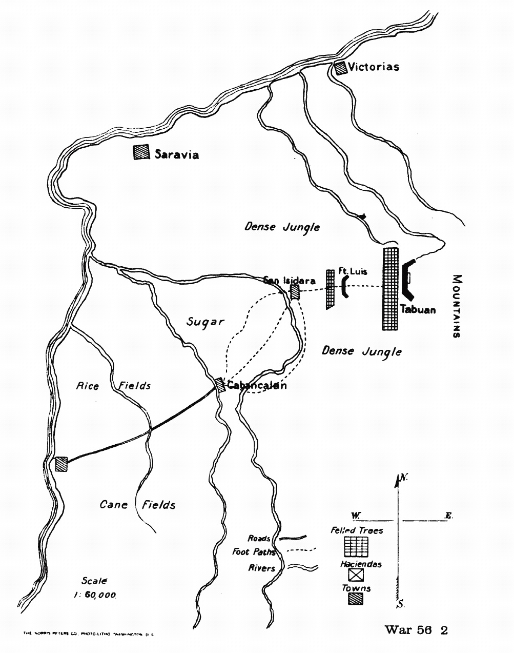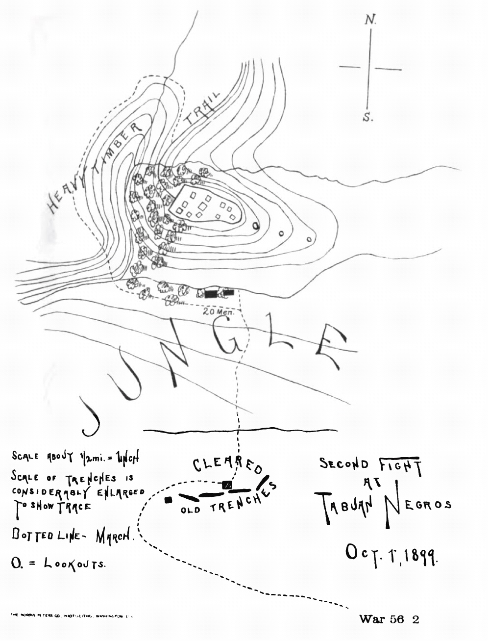 Leaving 6 men and 3 native police at the hacienda as a guard for the rations, the command started at midnight on the 30th for the camp of the insurgents at Tabuan. The Malugo River, which was but a few hundred yards away, was running like a mill race, and was fully 4 feet deep. But for a long rope that we had taken along a crossing could not have been effected without loss of life, as the men were taken off their feet by the current. By 3 a. m. all had crossed, and the march was resumed and kept up without any delay until about 10 a, m., when we found ourselves at the foot of a slope leading up to the position of the enemy and about three-quarters of a mile away.